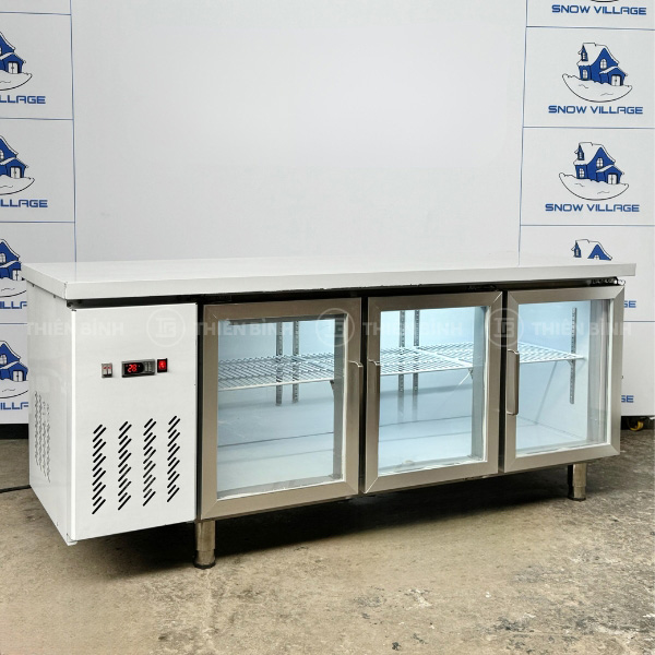 - Bàn mát 3 cánh kính Snow Village PLO.35L2Q có chiều dài 1800mm, thiết kế dạng mặt bàn rộng rãi dùng làm khu sơ chế thực phẩm, đặt thiết bị pha chế hoặc làm bàn chặt tiện dụng, bề mặt chắc chắn chịu lực tốt giúp tăng tính linh hoạt cho không gian bếp công nghiệp hoặc quầy bar chuyên nghiệp.