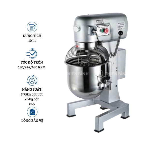 Bảo hành: 12 tháng | Dung tích: 10 lít; Tốc độ trộn: (Khuấy) 508, (Trộn) 258, (Móc) 156; Năng suất: 2.5 kg; Kích thước: 430 x 420 x 690 mm; Trọng lượng: 62 kg;
