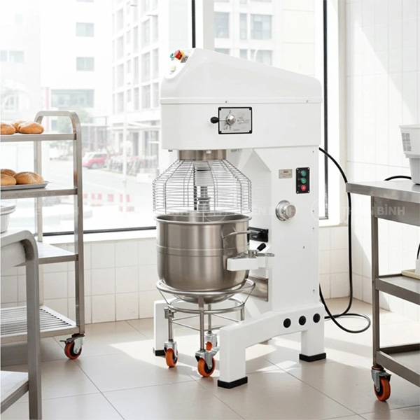 - Cối trộn được làm hoàn toàn bằng inox cao cấp, bề mặt sáng, hạn chế bám bẩn và thuận tiện cho việc vệ sinh sau mỗi ca sử dụng. Ngoài ra, cối trộn còn đi kèm khung đỡ có bánh xe hỗ trợ di chuyển khối bột nặng sau khi trộn xong, giảm sức thao tác và tăng tính linh hoạt khi sử dụng.