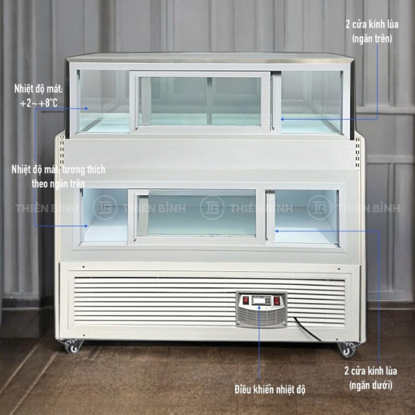 - Khoang bảo quản được chia làm 2 phần: phần trưng bày bảo quản phía trên và lưu trữ phía dưới. Phần trưng bày của tủ được bao quanh bởi kính siêu trong 1 lớp, có khả năng chống chịu va đập tốt. Thiết kế kính trong giúp gia tăng hiệu quả giá trị trưng bày, khách hàng có thể quan sát và lựa chọn bánh dễ dàng.