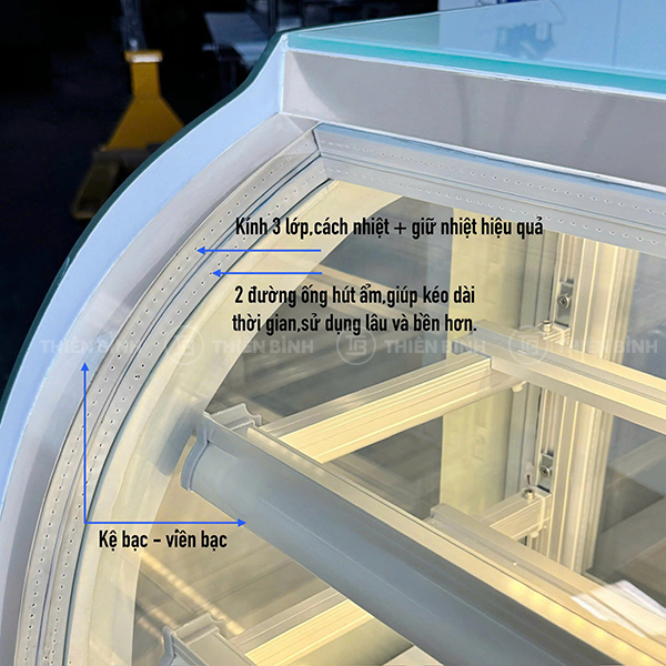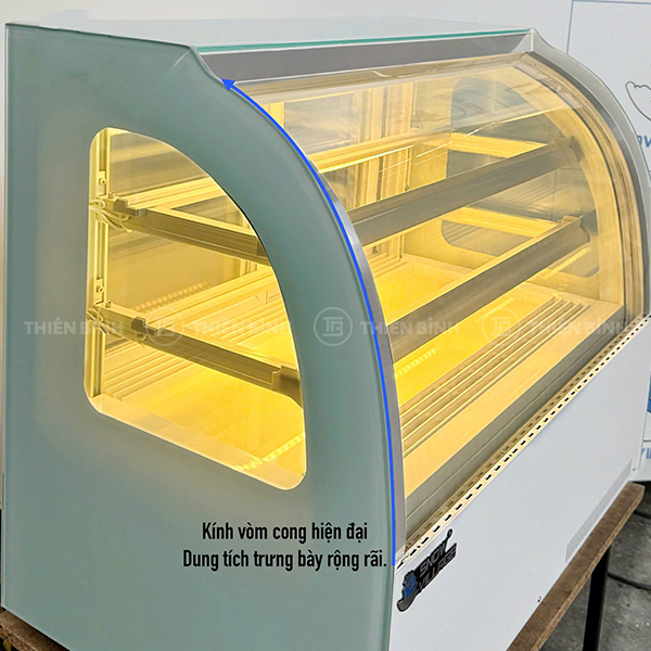 Phần tủ trưng bày phía trên được tạo bởi các mặt kính cường lực 3 lớp trong suốt khả năng chịu lực và chịu nhiệt tốt được trang bị hệ thống sấy kính chống đọng sương giúp mặt kính luôn khô thoáng dễ nhìn, tiện cho việc quan sát bánh bên trong.