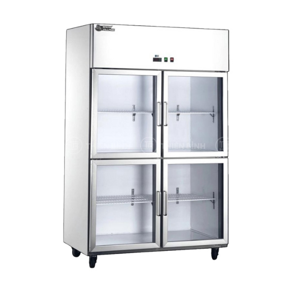 Thiết kế 4 cánh mở trước bằng kính cường lực trong suốt có trang bị sấy kính chống đọng sương, kết hợp với hệ thống đèn LED chiếu sáng bên trong tủ giúp nâng cao hiệu quả trưng bày sản phẩm để thu hút khách mua hàng.