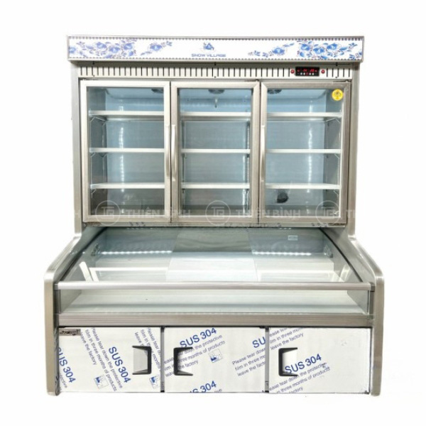 - Thiết kế chia khoang tiện lợi với ngăn mát trên gồm 3 cánh kính mở phía trước có sưởi kính chống đọng ngăn giữa gồm 3 cửa kính lùa ngang với 3 tầng trưng bày dạng bậc thang và ngăn dưới gồm 3 cửa mở bằng inox kín đáo dễ thao tác khi lấy hàng.